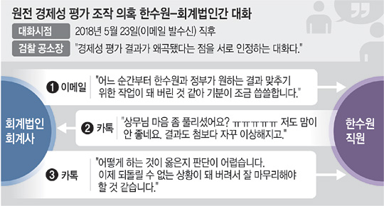 검찰이 ‘월성 원전 1호기 경제성 평가 조작’ 의혹 관련 경제성 평가 용역을 맡았던 회계법인과 한국수력원자력 담당자 간에 문재인 정부의 압력에 의한 수치 조작을 시사하는 이메일과 SNS 대화 내용을 확보했다. 검찰은 이 같은 대화에 근거해 청와대 등 윗선의 개입으로 월성 1호기 조기폐쇄의 핵심 근거로 쓰인 외부 경제성 평가가 객관성을 상실한 ‘맞춤용 결과물’이 됐다고 판단했다.