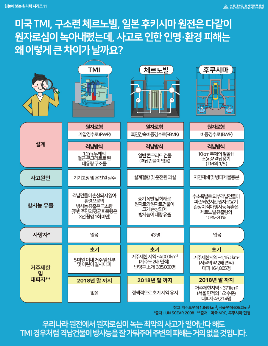 • 제목 [한눈에 보는 원자력 시리즈 11] 미국 TMI, 구소련 체르노빌, 일본 후쿠시마 원전은 다같이 원자로심이 녹아내렸는데, 사고로 인한 인명·환경 피해는 왜 이렇게 큰 차이가 날까요?