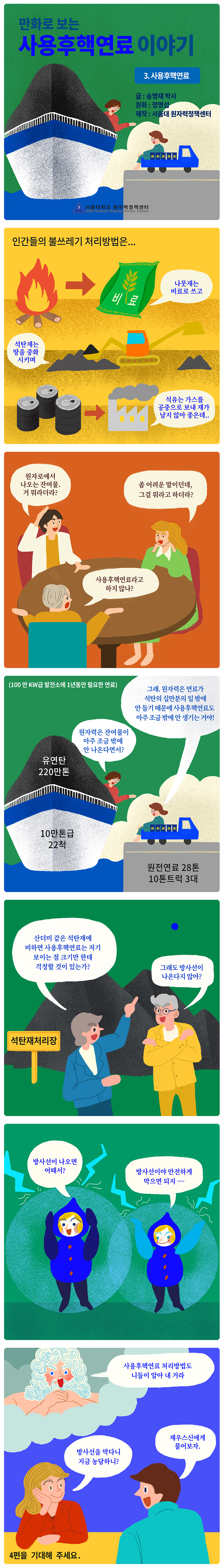 서울대학교 원자력 정책센터의 중장기 과제 수행작 중 하나로 송명재 박사가 주관하여 만든 만화로 보는 원자력 시리즈 입니다. 오늘은 세 번째 '사용후핵연료' 편 입니다.