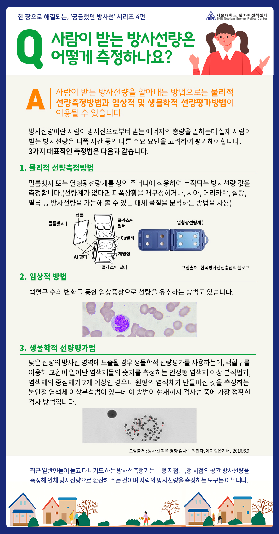 네번째 시리즈는 '사람이 받는 방사선량은 어떻게 측정하나요?' 편입니다.방사선 측정방법은 3가지가 있는데, 알아보도록 하겠습니다.