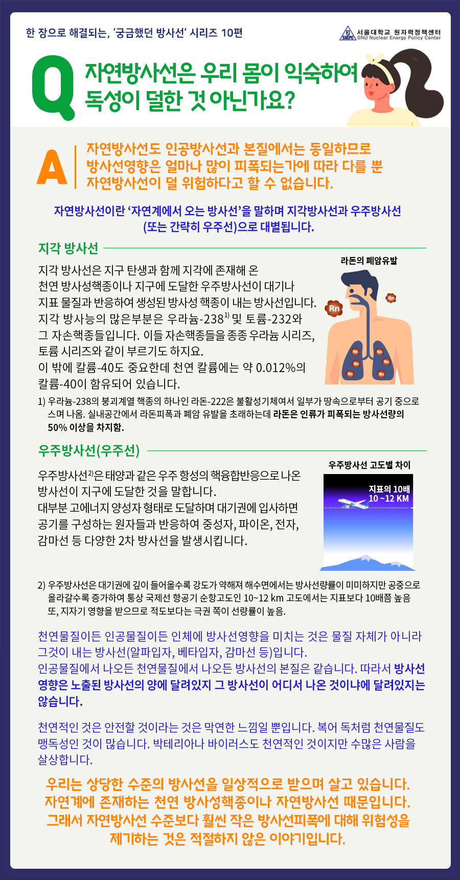 열번째째 시리즈는 '자연방사선은 우리 몸이 익숙하여 독성이 덜한 것 아닌가요?' 편입니다.자연 방사선의 종류에 대해 알아보고 몸에 영향을 미치는 요인이 무엇인지 알 수 있습니다.