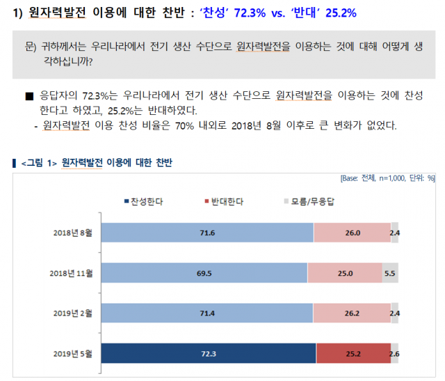 2018년 8월 부터 2019년 5월 까지 매 3개월 마다 한국원자력학회가 동일한 문항으로 다른 여론조사 기관에 의뢰하여 수행한 원자력 인식조사 결과 중 원자력 이용 찬반에 관한 결과입니다.